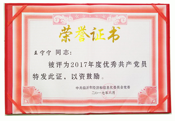 2017年6月,公司優(yōu)秀共產(chǎn)黨員王寧寧同志,被臨沂市經(jīng)濟(jì)和信息化委員會(huì)黨委授予優(yōu)秀共產(chǎn)黨員榮譽(yù)稱號(hào)。